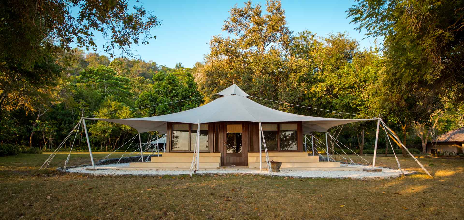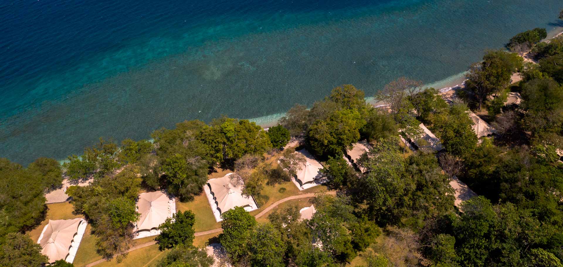 The inviting turquoise waters fringed by the white-sand beach shows little sign of human presence. The tents lie beyond the natural tree line, unobtrusively placed within the natural landscape.