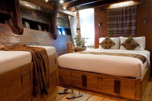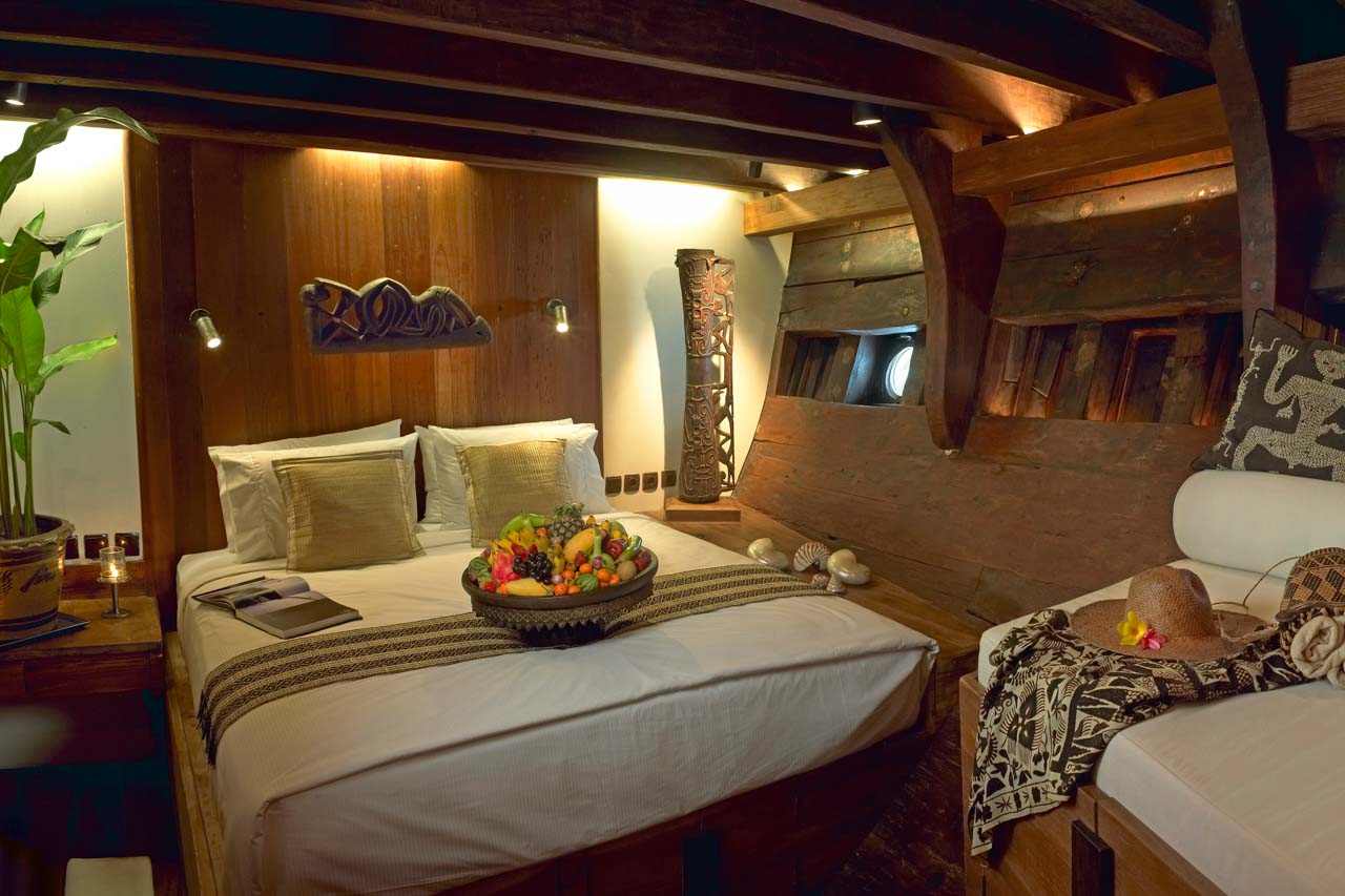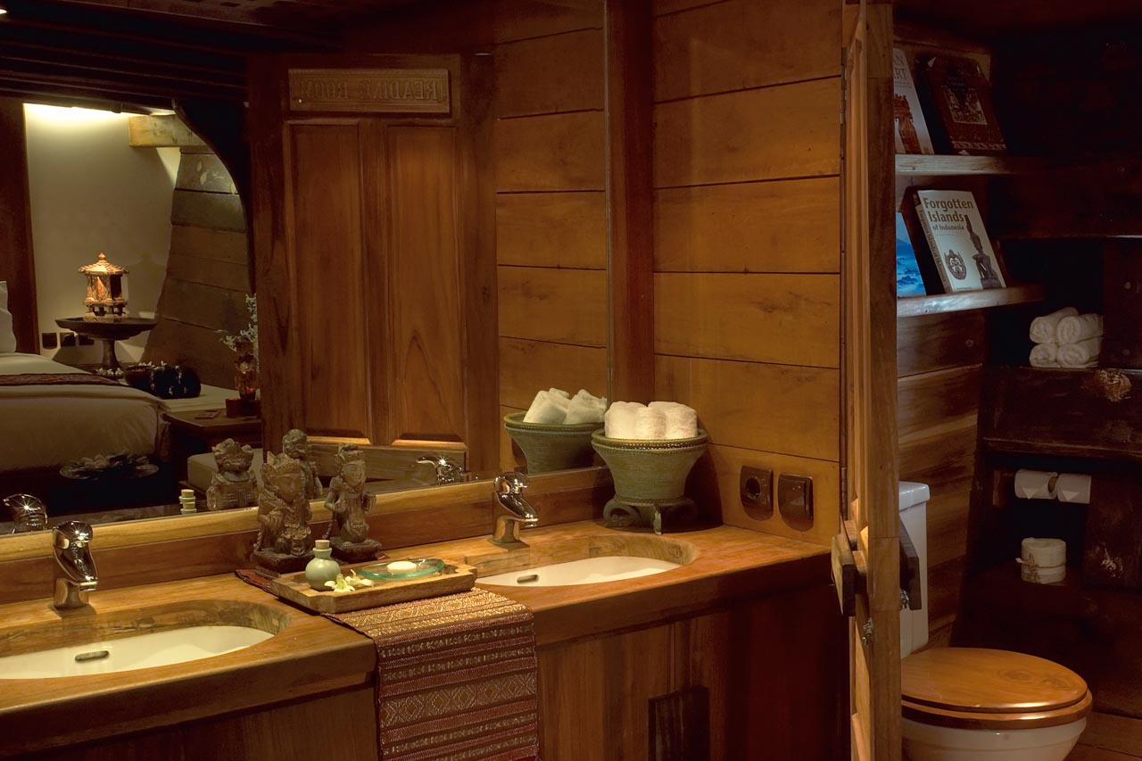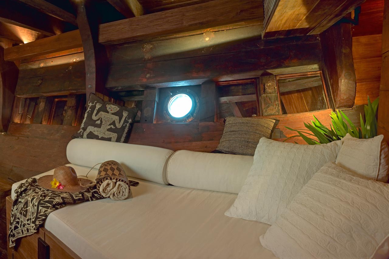 Silolona features five spacious, air-conditioned, ensuite cabins below deck. The three master suites – Asmat, Bali and Java – are furnished with king beds and tastefully appointed with the colors, textures, and styles of their namesake islands. Two cabins, furnished with double beds, boast the exotic decor of Sumba and Borneo.